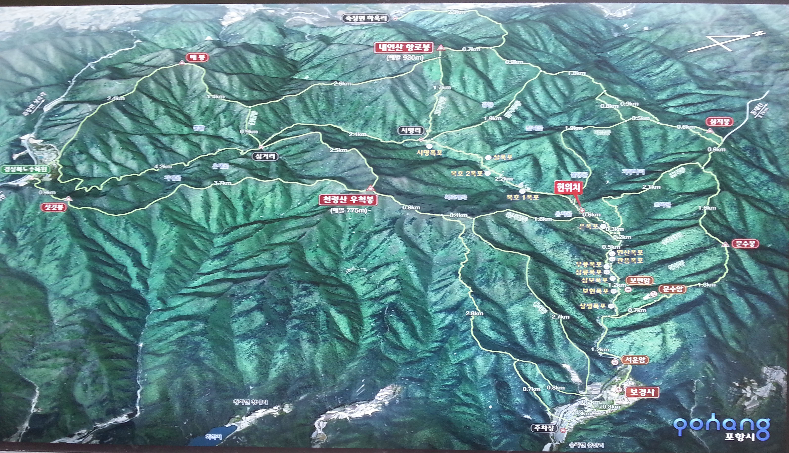## 주차장(09:00)  → 보경사 → 문수암 → 문수봉 → 삼지봉 → 향로봉(930m) 13:40  → 시명리 → 12폭포 → 보경사(17:20)