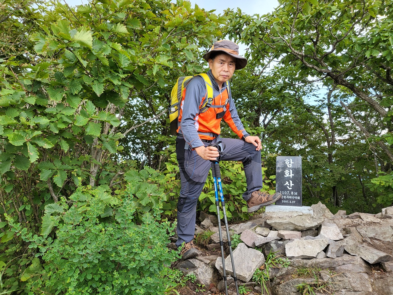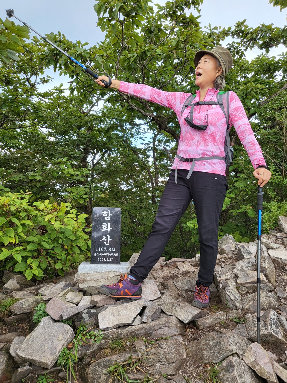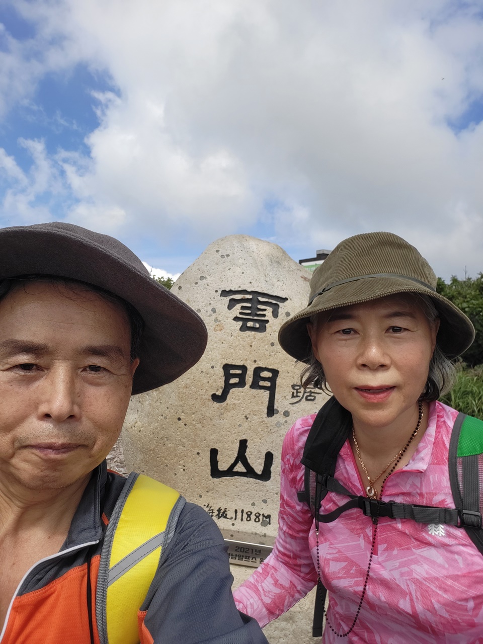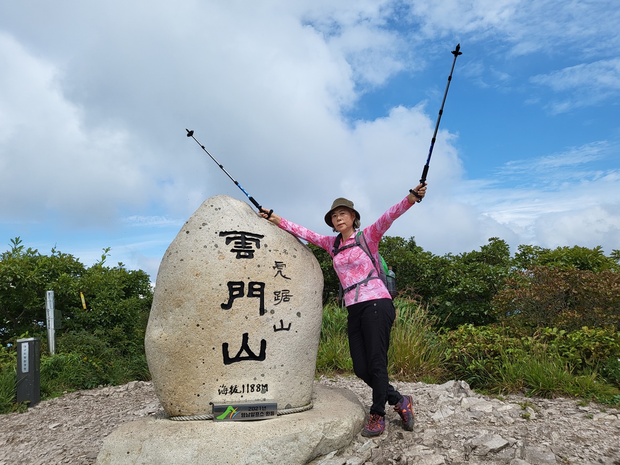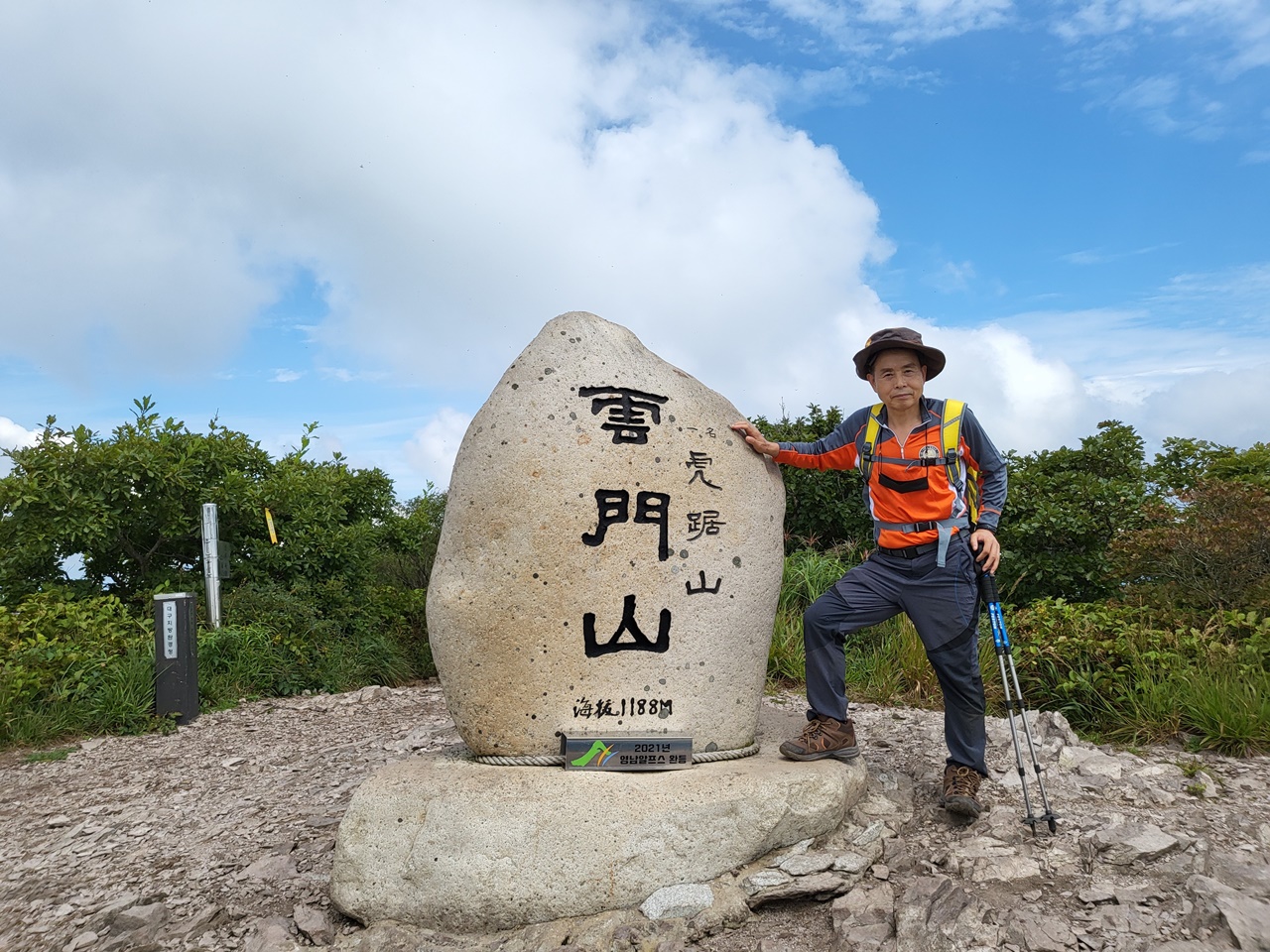 ## 영남알프스 9봉 등반 ## ## 4/9 운문산(1188m) 등반 - 2021년 9월 9일(목) # 상양마을 등산로입구(10:00) → 아랫재(11:00) → 운문산 정상(12:20) → 함화산 정상 → 아랫재 → 출발점 복귀(15:00) === 운문산 정상에서 컵라면으로 점심 ===
