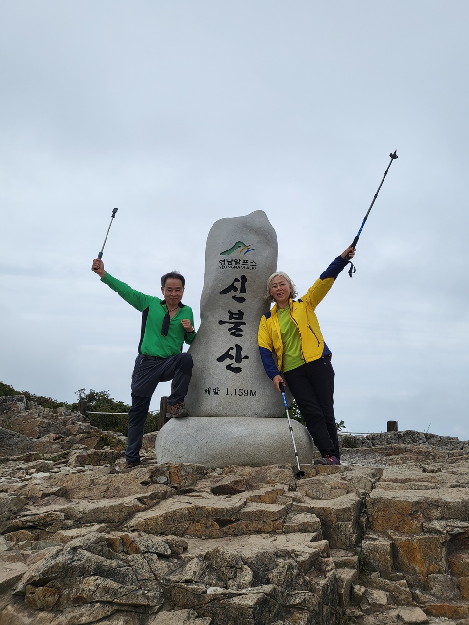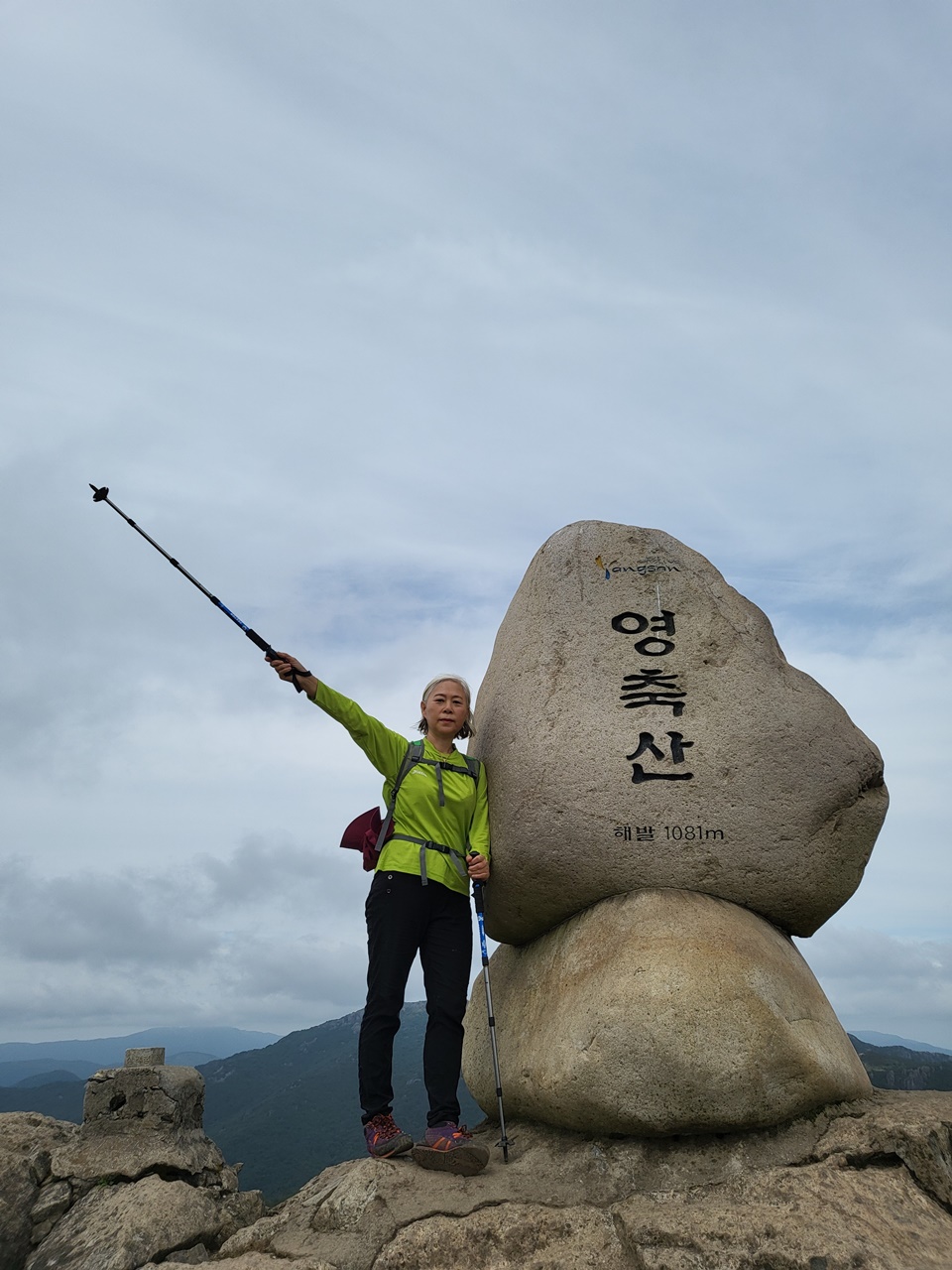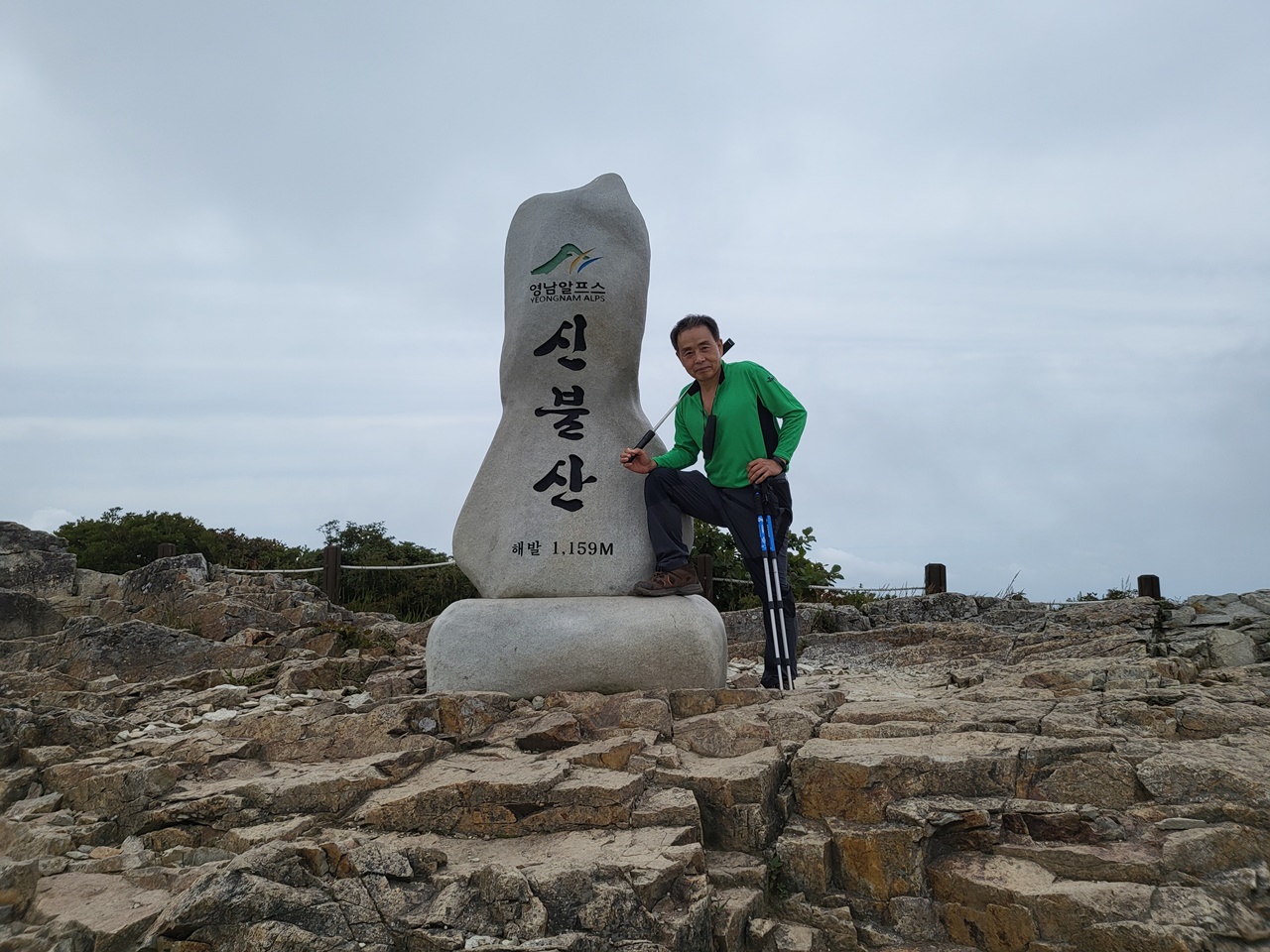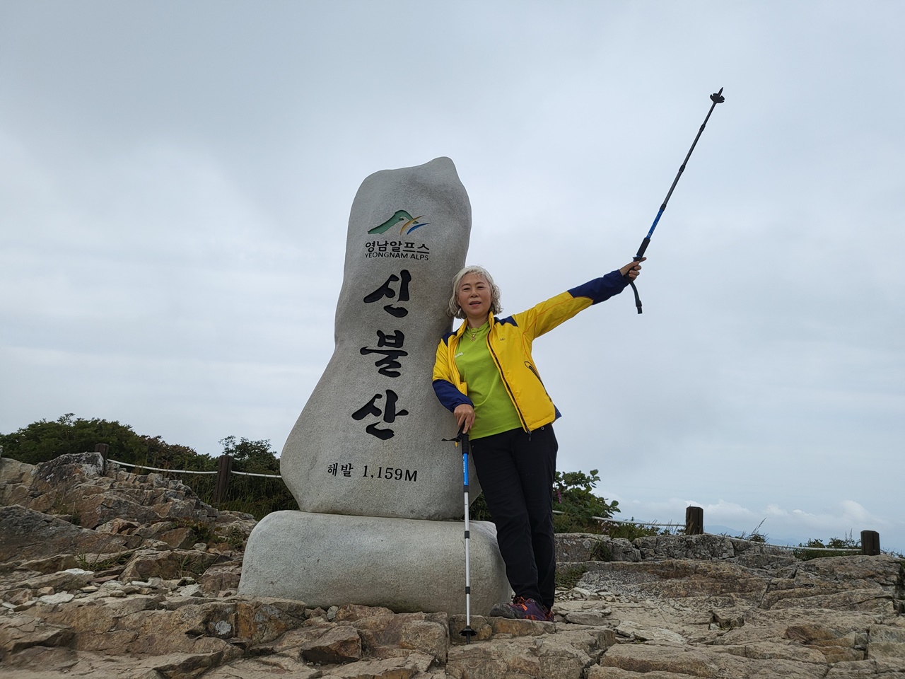 ## 영남알프스 9봉 등반 ## ## 5,6/9 영축산(1081m),신불산(1159m) 등반 - 2021년 9월 13일(월) # 지산마을 노인정 주차장(10:30) → 취서산장 → 영축산 정상(13:00) → 신불산 정상(15:00) → 영축산 → 취서산장 → 출발점 복귀(18:00) === 영축산 정상에서 컵라면으로 점심 ===