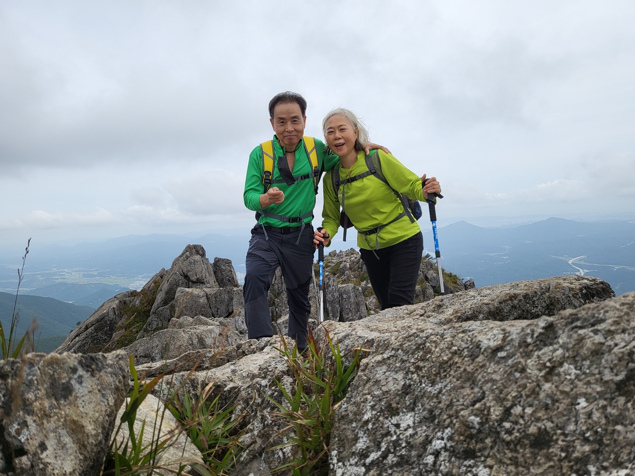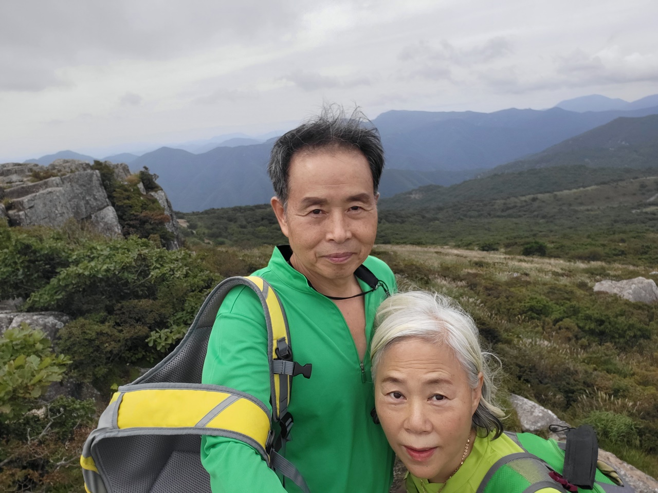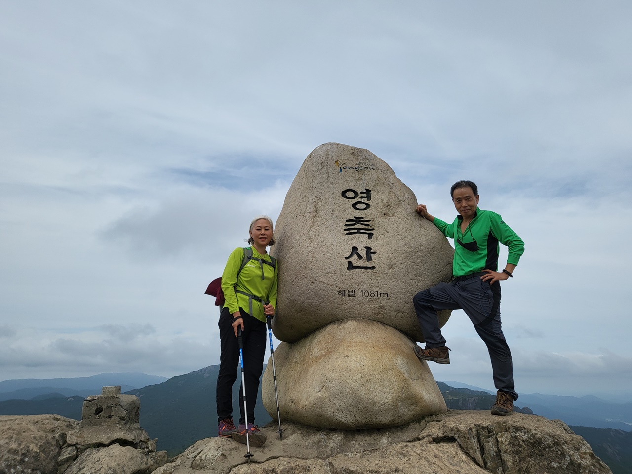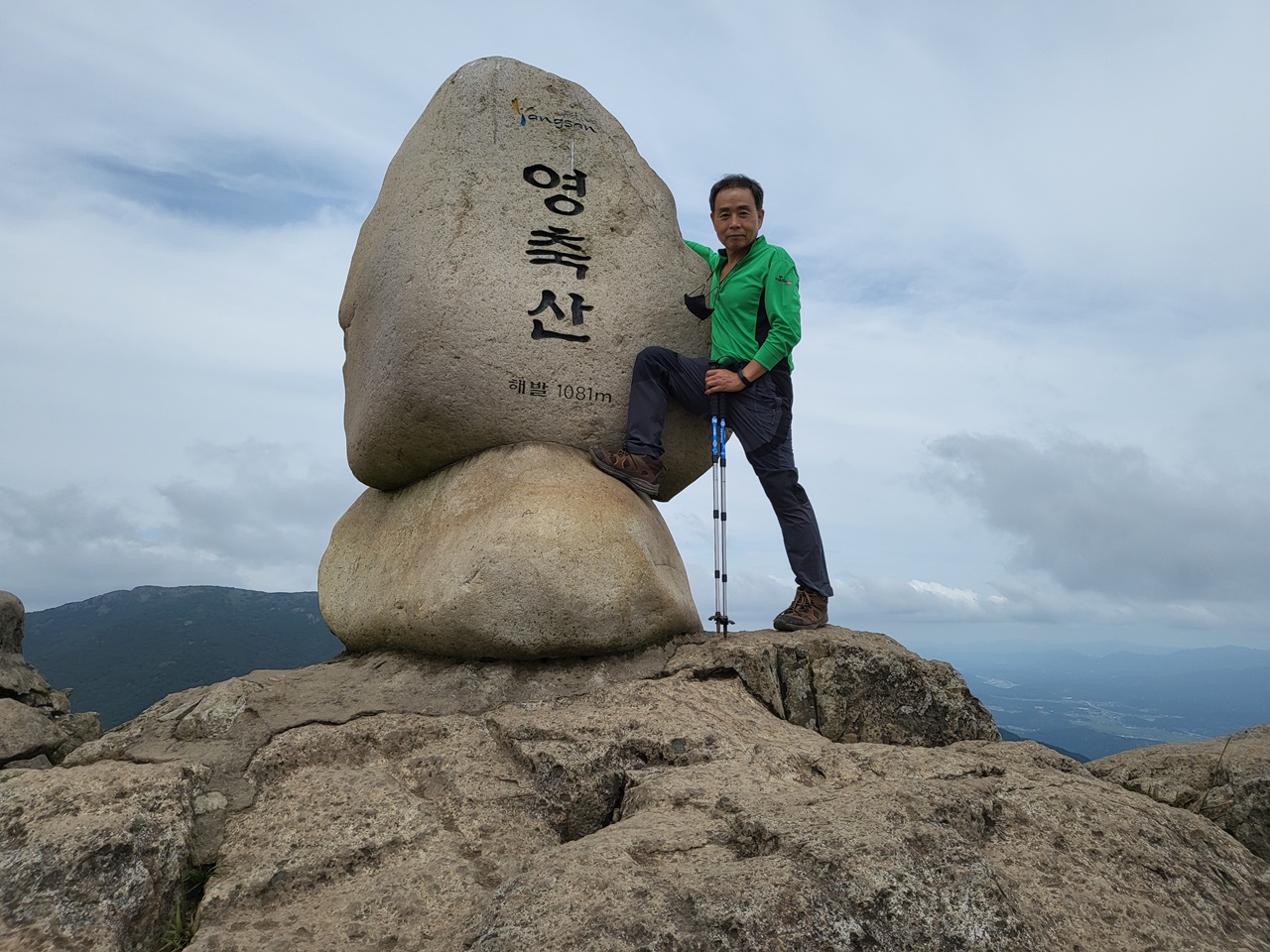 ## 영남알프스 9봉 등반 ## ## 5,6/9 영축산(1081m),신불산(1159m) 등반 - 2021년 9월 13일(월) # 지산마을 노인정 주차장(10:30) → 취서산장 → 영축산 정상(13:00) → 신불산 정상(15:00) → 영축산 → 취서산장 → 출발점 복귀(18:00) === 영축산 정상에서 컵라면으로 점심 ===
