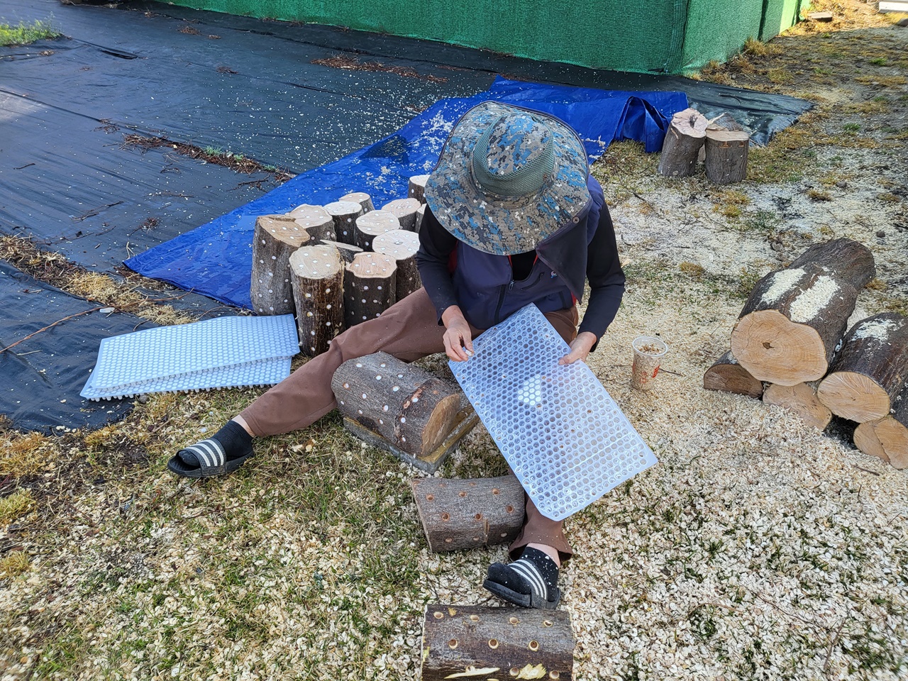 ### 밭에서 베어낸 단풍나무에 느타리 버섯 종균을 접종함.