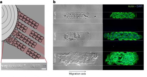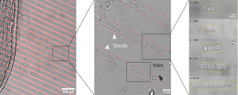 연구진은 패트리 접시 위에 일종의 기찻길인 일차원 경로를 인쇄하고, 여러 세포로 구성된 제브라피시 비늘을 뒀다. 처음에 세포들은 표면 접착 분자를 이용해 마치 손을 잡은 것처럼 서로를 붙잡고 있다. 결합이 끊어지면 세포들은 작은 그룹으로 모여 일차원 경로를 따라 기차처럼 앞으로 나아간다. 10량짜리 기차와 18량짜리 기차가 있는 것처럼 세포 기차의 길이도 환경에 따라 항상 다르다.