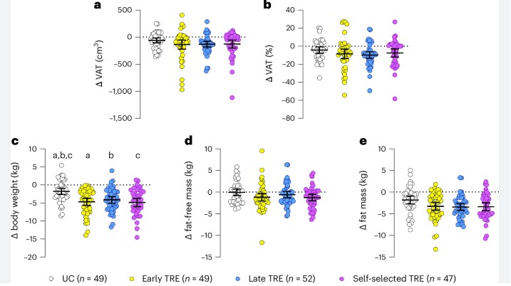 시간 제한 식사와 에너지 제한 식사 병행하자 체중 감소 효과 상승 최근 새로운 식이요법으로 ‘시간 제한 식사(Time-Restricted Eating, 이하 TRE)’가 주목받고 있다. TRE는 하루 10시간 이내에 음식을 섭취하고 나머지 시간은 금식하는 이른바 간헐적 단식을 뜻한다. 기존의 에너지 제한 식단이 체중 감량에는 긍정적인 효과가 있지만 장기적으로 유지하기 어려운 반면 TRE는 실현 가능성이 높고 지속하기 쉬워 많은 ‘다이어터’가 시도하는 대안이기도 하다. 하지만 TRE의 시간대별(아침, 저녁, 자유시간) 효과에 대한 구체적인 연구가 부족해 간헐적 단식을 하면서도 체중 감소 효과를 보지 못한 사례가 적지 않다. 이에 그라나다대학교 연구팀은 TRE의 실효성을 높일 수 있는 세 가지 방법을 참가자에게 적용하는 임상시험을 진행했다. 우선 비만, 과체중 상태의 30~60세 성인 2천598명을 모집하여 이중 연구 기준을 충족하는 197명(남성 99명, 여성 98명)을 선정했다. 그리고 이들을 무작위로 네 그룹으로 나누었는데, 첫 번째 그룹은 일반 관리 그룹으로 기존 식단을 유지하면서 지중해식 식단을 병행했다. 두 번째 그룹은 아침형 TRE 그룹으로 오전 7시부터 11시 사이에 식사를 했고, 세 번째 그룹은 저녁형 TRE 그룹으로 오후 1시부터 7시 사이에 식사를 했다. 마지막은 자유선택형 TRE 그룹으로, 각자 원하는 8시간 이내에 식사 시간을 선택했다. 총 12주 동안 진행된 이 과정 후에 연구진은 대상자의 내장지방(VAT), 피하지방(SAT), 근육간 지방(IMAT), 체중, 혈압, 공복혈당 등의 지표를 평가했다. 연구결과 TRE를 병행한 그룹과 일반 관리 그룹 모두에서 내장 지방(VAT)이 36% 감소했다. 다만, 일반 관리와 TRE를 병행한 사람은 영양교육과 같은 일반 관리만 받는 사람에 비해 3~4kg 가량 체중이 감소한 것으로 나타났다. 실험 후 내장 지방 및 신체 구성의 변화. ?Nature Medicine