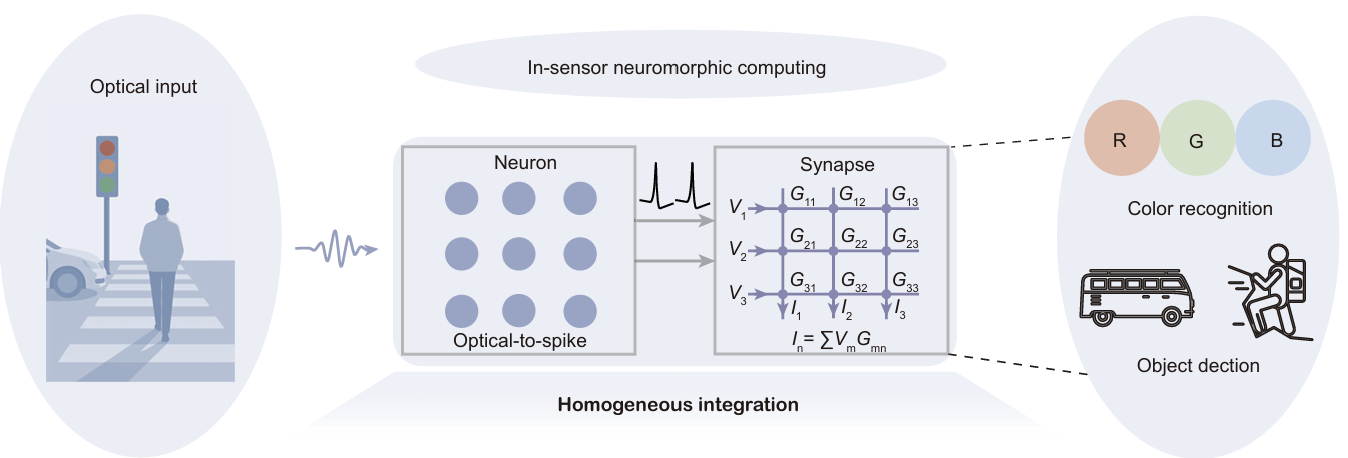 뉴로모픽 반도체는 이와 같은 뇌의 작동 방식을 모방하기 위해 인공 뉴런과 시냅스를 회로 안에 촘촘히 배치한다. 여기서 ‘인공 뉴런’은 뇌의 신경세포처럼 신호를 판단하여 다음으로 보내는 작은 부품을, ‘시냅스’는 뉴런과 뉴런을 잇는 연결부로 신호가 얼마나 세게 지나갈지 조절하는 다이얼 같은 소자를 의미한다. 카메라를 예로 들면 센서로 들어온 빛을 통해 중요한 정보인지 여부를 자체적으로 결정하고 이를 기준으로 조금씩 학습해 가는 것이다. 하지만 기존의 카메라와 같은 광센서는 이미지를 연속적인 전압 신호로 만들어 멀리 있는 프로세서로 전송할 뿐 스스로 판단하지 못하고, 기억을 담당하는 메모리 소자 역시 이런 센서와 한 몸처럼 붙어있지 못한다.