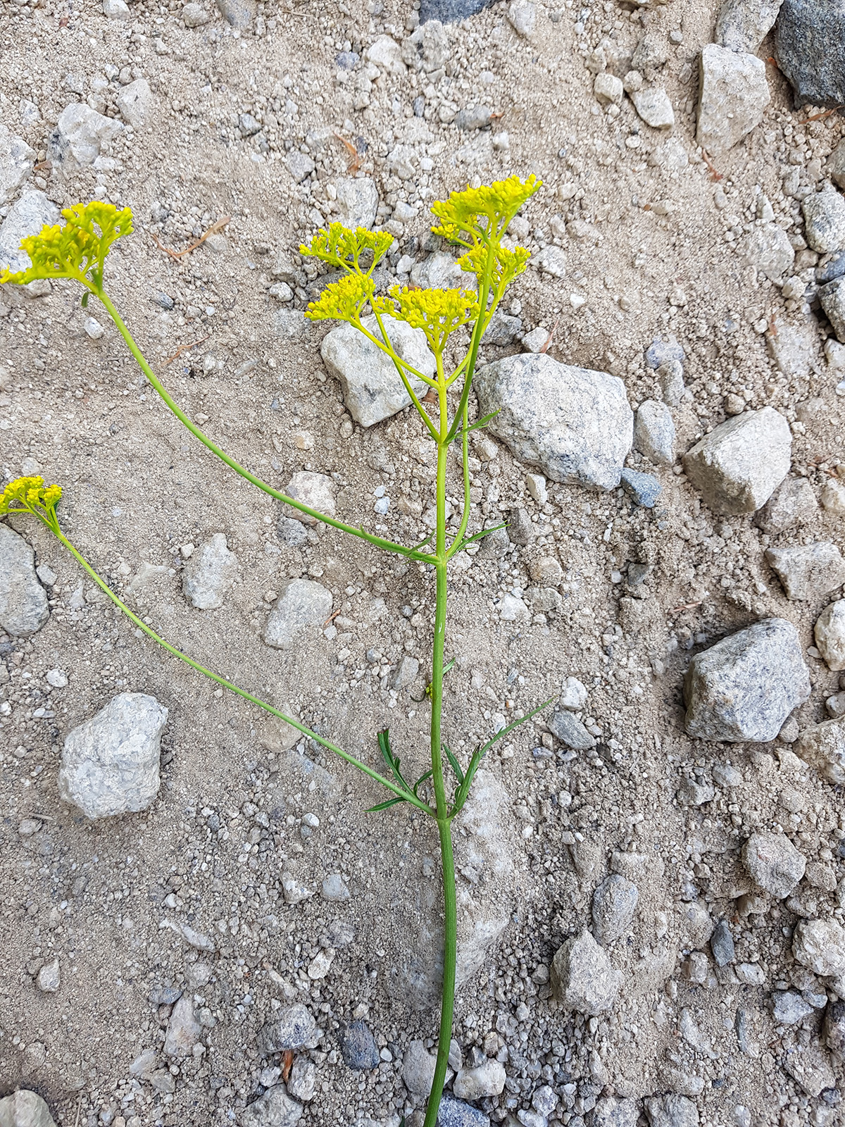산이나 들에서 자란다. 높이 60~150cm 내외이고 뿌리줄기는 굵으며 옆으로 뻗고 원줄기는 곧추 자란다. 윗부분에서 가지가 갈라지고 털이 없으나 밑부분에는 털이 약간 있으며 밑에서 새싹이 갈라져서 번식한다. 잎은 마주나며 깃꼴로 깊게 갈라지고 양면에 복모가 있고 밑부분의 것은 잎자루가 있으나 위로 올라가면서 없어진다. 꽃은 여름부터 가을에 걸쳐서 피고 노란색이며 산방꽃차례[揀房花序]를 이룬다. 화관은 노란색으로 지름 4mm이고 5개로 갈라지며 통부가 짧고 수술은 4개, 암술은 1개이다. 씨방은 3실이지만 1개만이 성숙하여 타원형의 열매로 된다. 열매는 길이 3~4mmm로서 약간 편편하고, 배면에 맥이 있으며 뒷면에 능선이 있다.